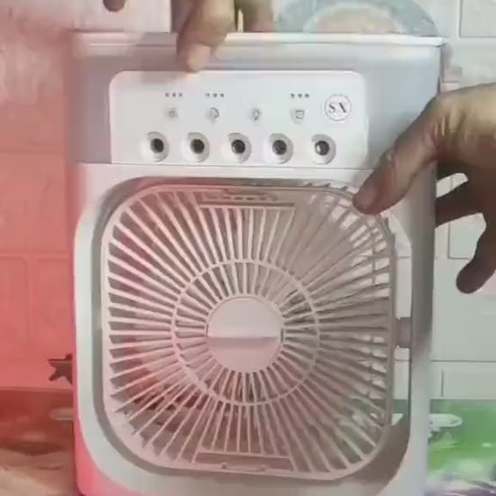 Beat the heat in style with this 3-in-1 Portable Air Conditioner Fan. Designed for ultimate comfort, it combines cooling, humidifying, and LED night light functions in one compact device. Simply add water or ice, connect via USB, and enjoy a refreshing fine mist that lowers the temperature around you while keeping the air comfortably moist.